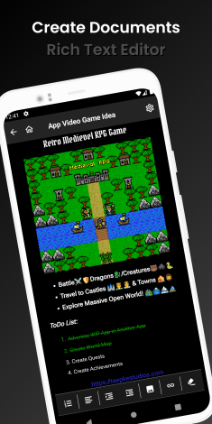 • DOCUMENTS: Create Documents with complete customization. When you want to be bold by using custom font styles, colors, bullet points, URL links, text alignments, insert photos, and more, the Document file is for you! Document files are saved and shared as normal Word Documents!
